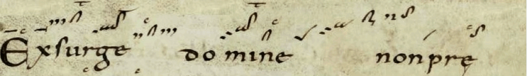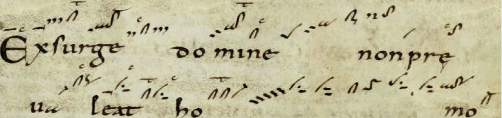 L’analyse de la notation du Graduel Exsurge domine non praevaleat homo (tiré du Cantatorium de Saint-Gall, vers 922/925) peut servir d’exemple pour l’étude des différents neumes, une brève explication de leur interprétation et leur transcription en notation carrée.