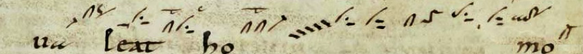 ![]() porrectus fl avec ténéré | ![]() | trois notes descendantes et ascendantes ( porrectus ) avec flexion finale ajoutée (descente) ; coupure neumatique intermédiaire , indiquant une articulation séparée ; long ténéré intermédiaire | deux clivis consécutifs (une interprétation improbable qui permettrait l’unisson ou même une descente entre la 2e et la 3e note) |